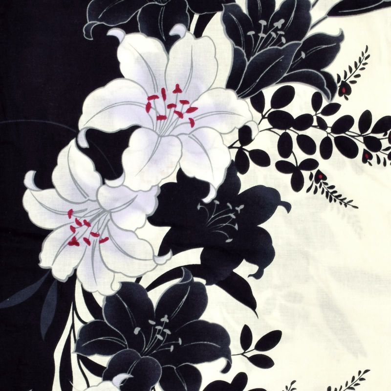 【カラー】縦に分かれたオフホワイトと黒の地。グレーのラインで描かれた百合の花模様。花は、白にブルーグレーのぼかしや黒。赤の蕊がポイントです。黒いシルエットの萩。