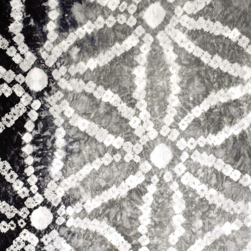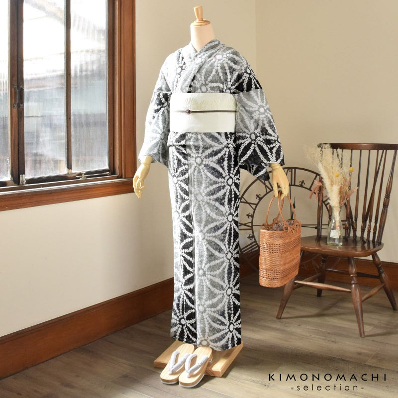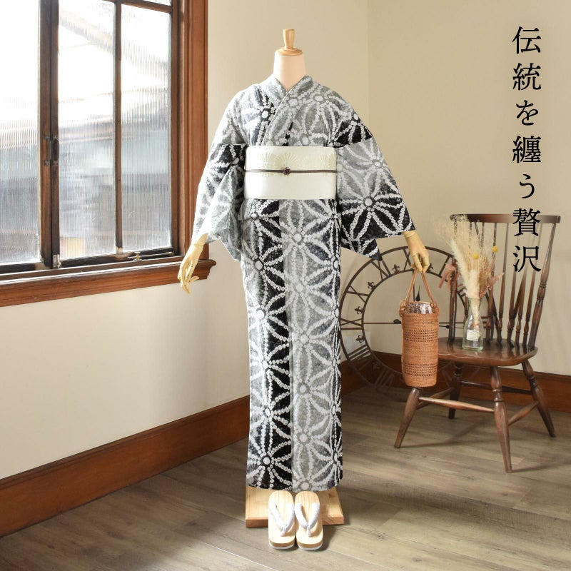 【色柄】グレーと墨黒の縦ぼかしに白。白の絞りを連ねた星七宝つなぎの柄は格好良さの中に柔らかさを感じさせます。