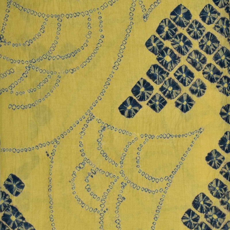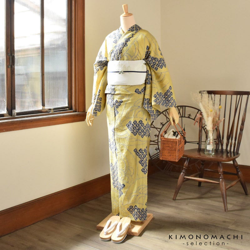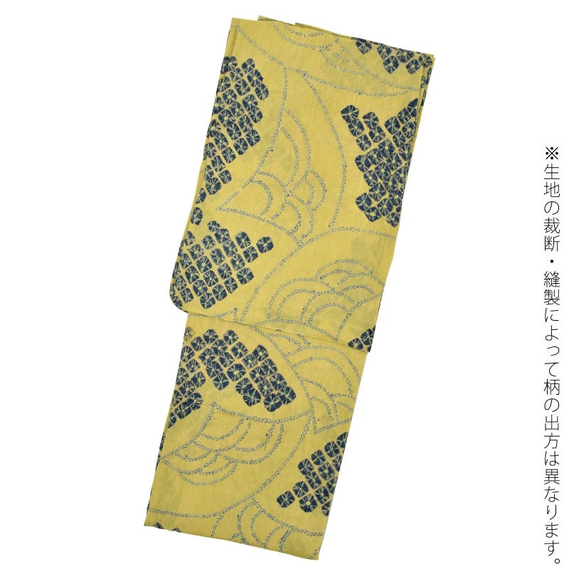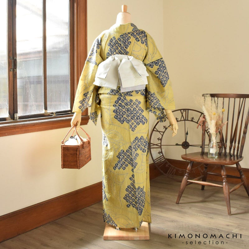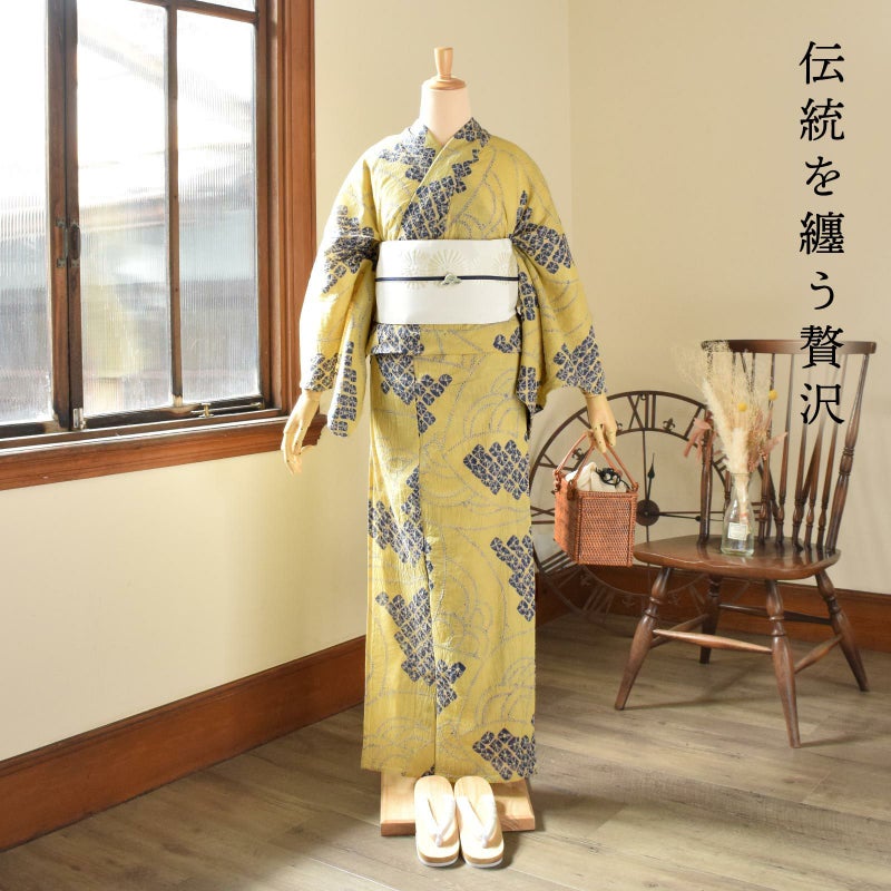 【色柄】灰みの落ち着いた黄色の地に紺色。細かな絞りを連ねた青海波と、紺のくも絞りが扇のような配置で表現されています。古典的でありながら、モダンな雰囲気があります。