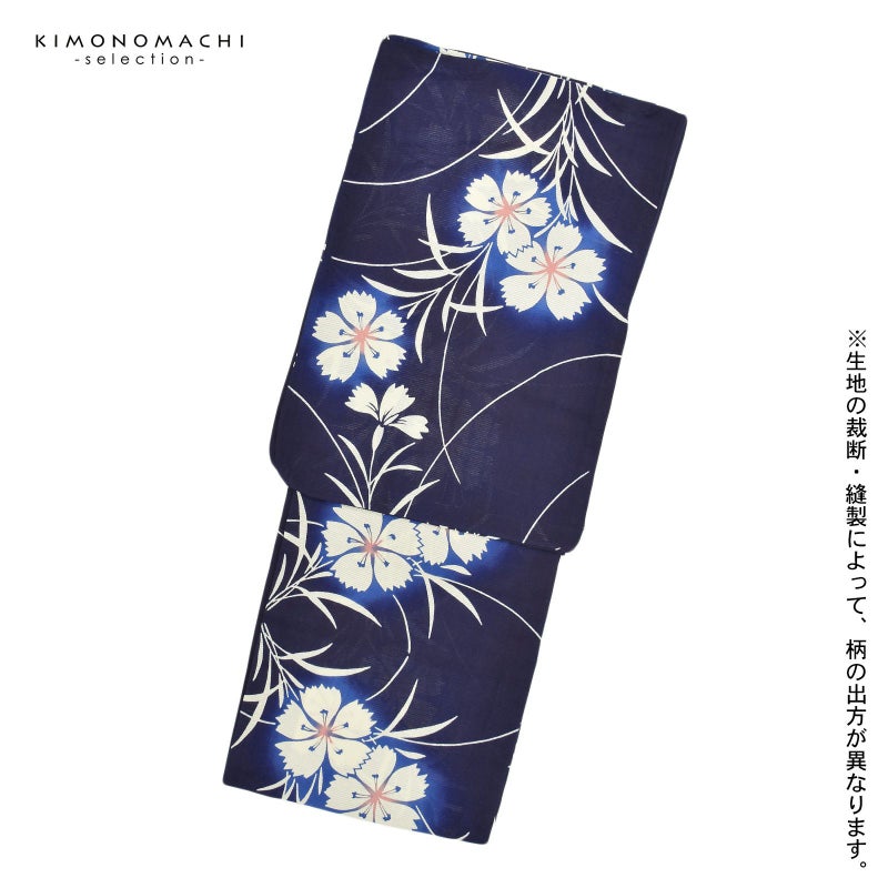 深い紺青の地に生成り色で表現された撫子の花。花に淡い桃色と青のぼかし。弧を描くように配置された大きな撫子が優し気な印象です