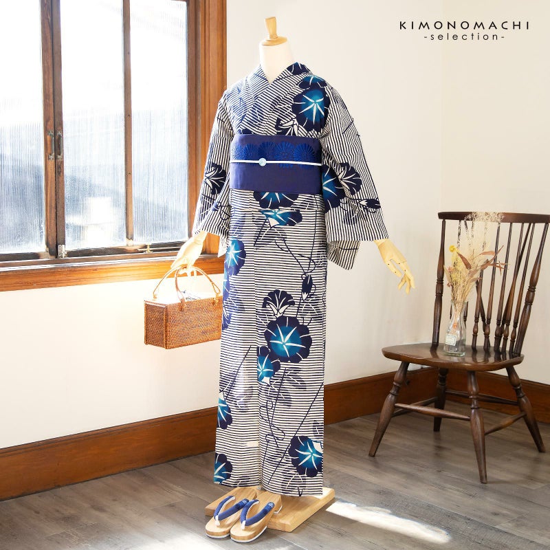 生成り色と白の細かな縦縞の地に、濃紺の横縞。大小の朝顔の花やつぼみ。花の中心に青や水色のぼかしが入っています。葉は横縞で表現されており、まるですだれに絡んでいるかのようです。