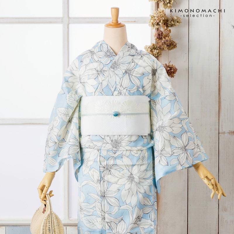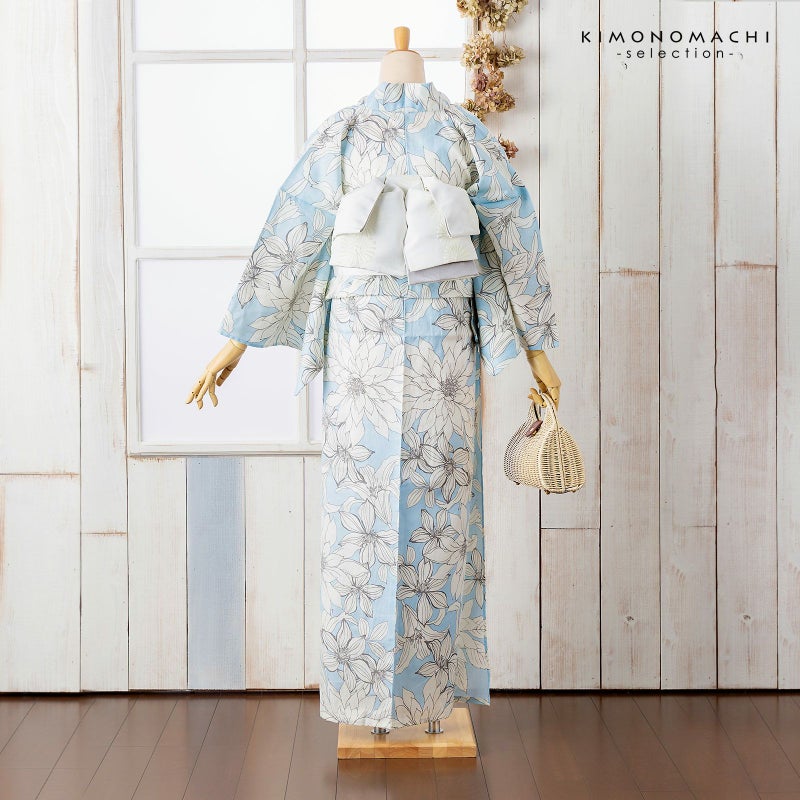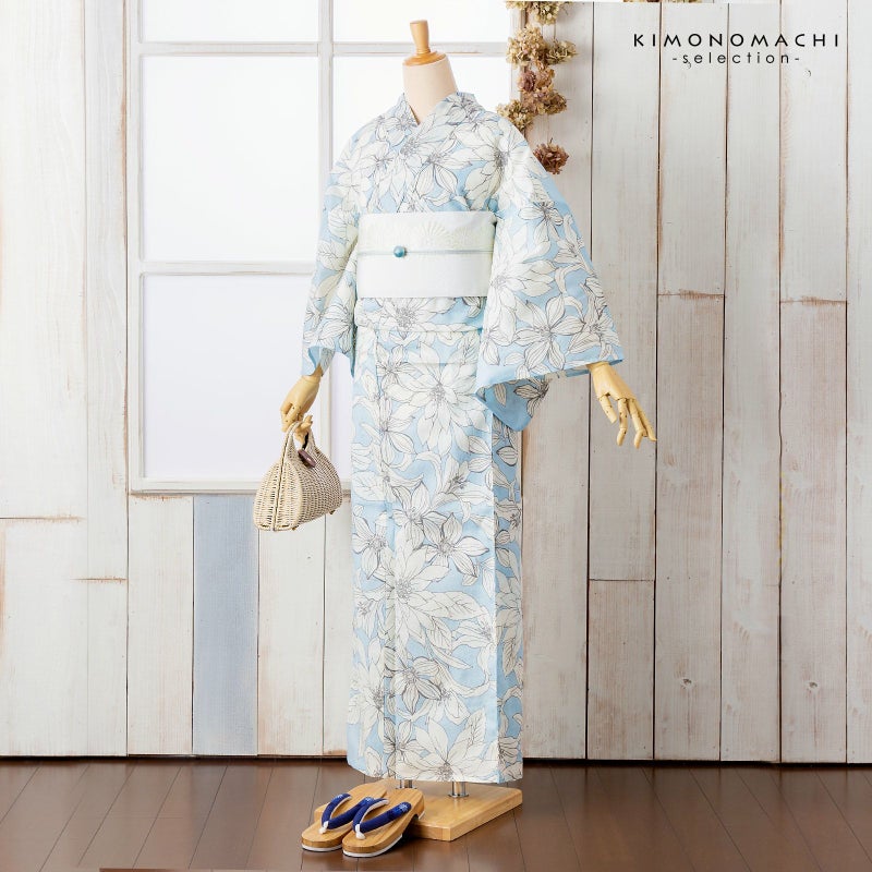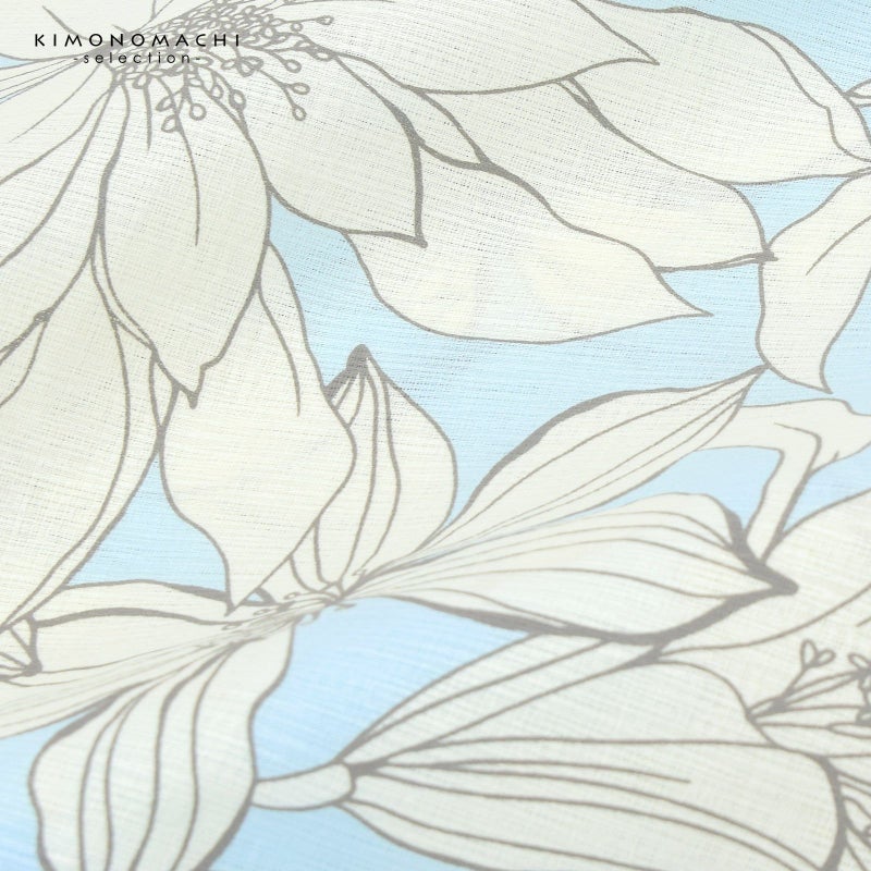 やや灰みの明るい水色の地。チャコールの線で描かれたクリーム色の百合の花々。手描き調の花々がお洒落で、涼し気な色合いの浴衣です。