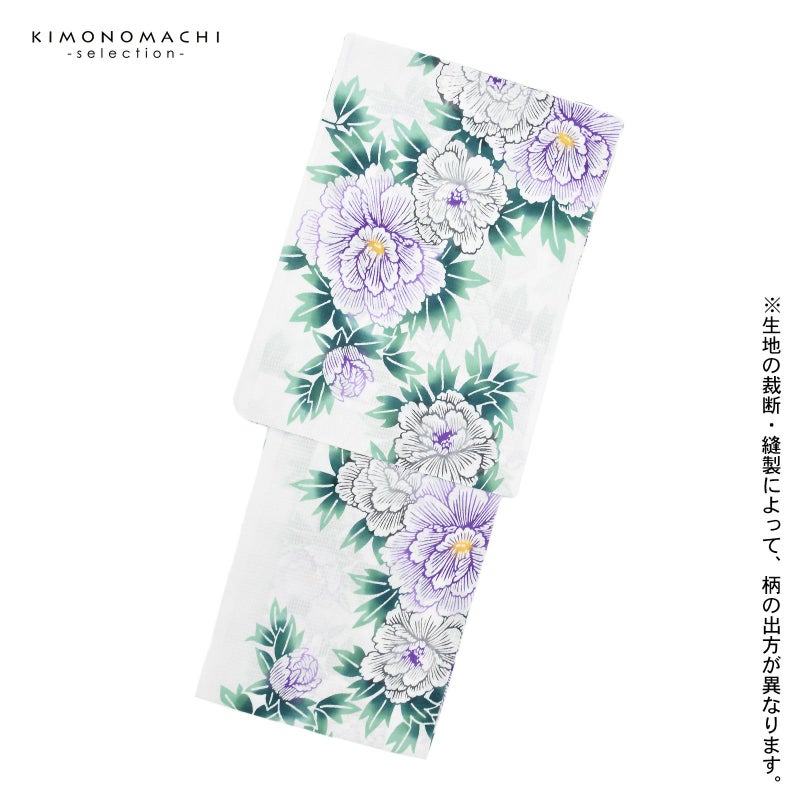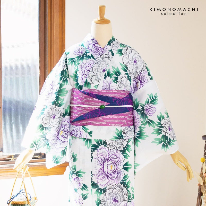 格子の凹凸のある綿紅梅の生地です。白地に紫色、グレーの線に明るい黄色の花芯で表現された牡丹の花。くっきりとした青緑の葉が鮮やかで涼し気な印象に。ぼかしの色の変化や深い染めが魅力です。