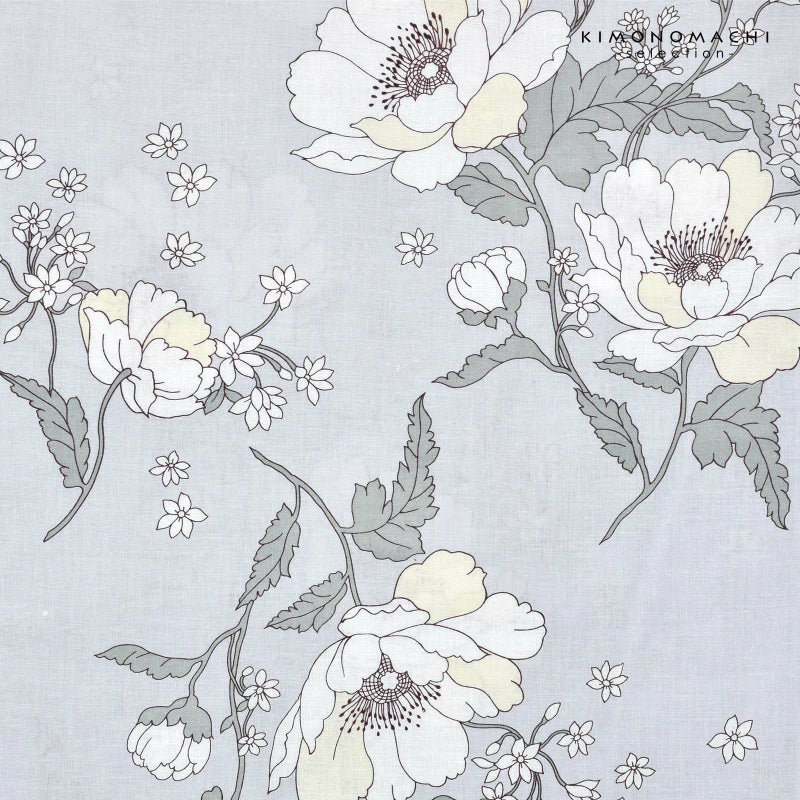 淡いグレーの地に濃茶色の線で描かれたアネモネや小花模様。オフホワイトや薄クリーム色の花びら、グレイッシュな薄緑色の葉。