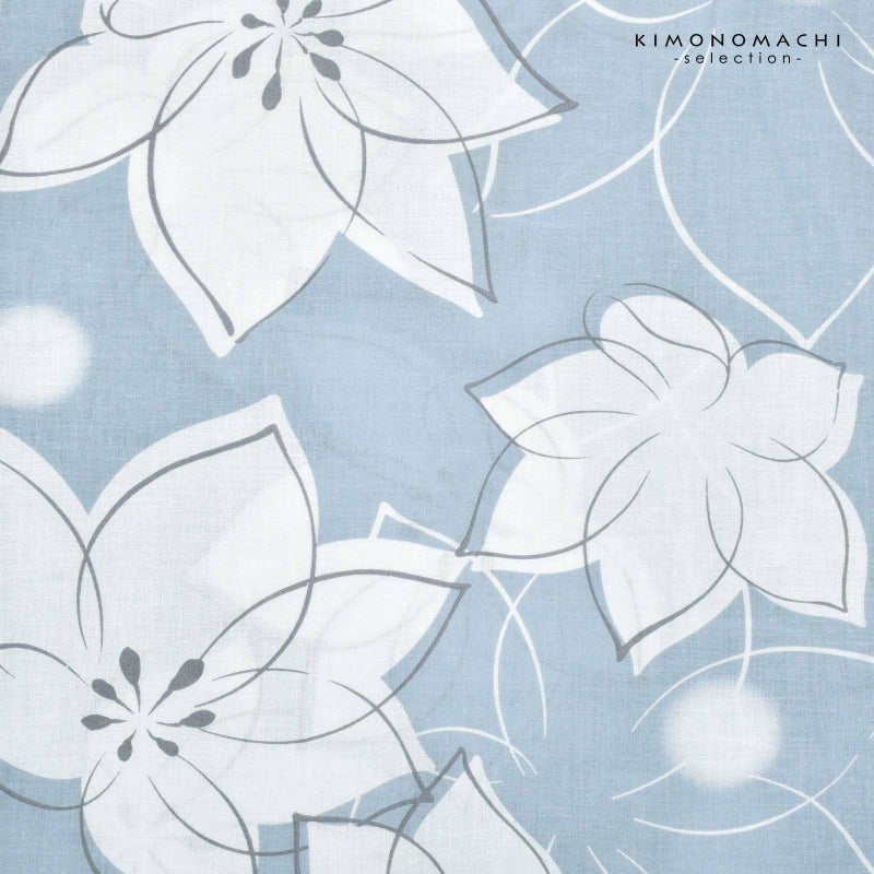 灰みの水色の地に白いぼかしのドット。白色の花に浅いグレーの蕊で抽象的に表現された桔梗の花。グレーや白の輪郭線。