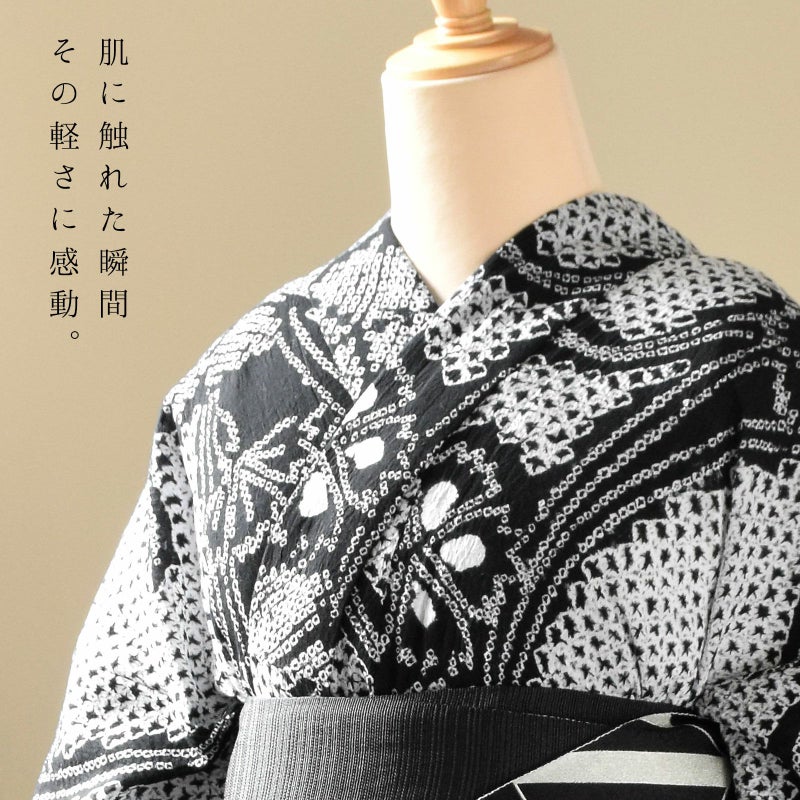 大人のお洒落な絞りの浴衣単品です。お仕立て上がりなので、すぐにご着用いただけます。絞りがやわらかで肌触りがよく、生地の凹凸があることで、肌にはり付きにくく、さわやかな着心地です。盆踊り、夏祭りにはもちろん、襦袢を合わせてちょっとしたお出かけにも、踊りなどのお稽古にもいいですね。
