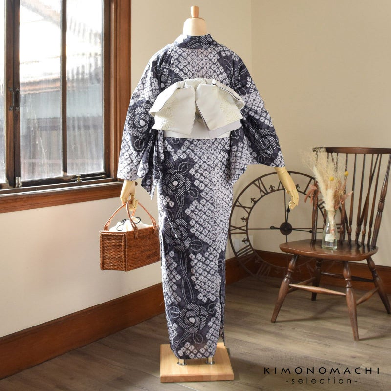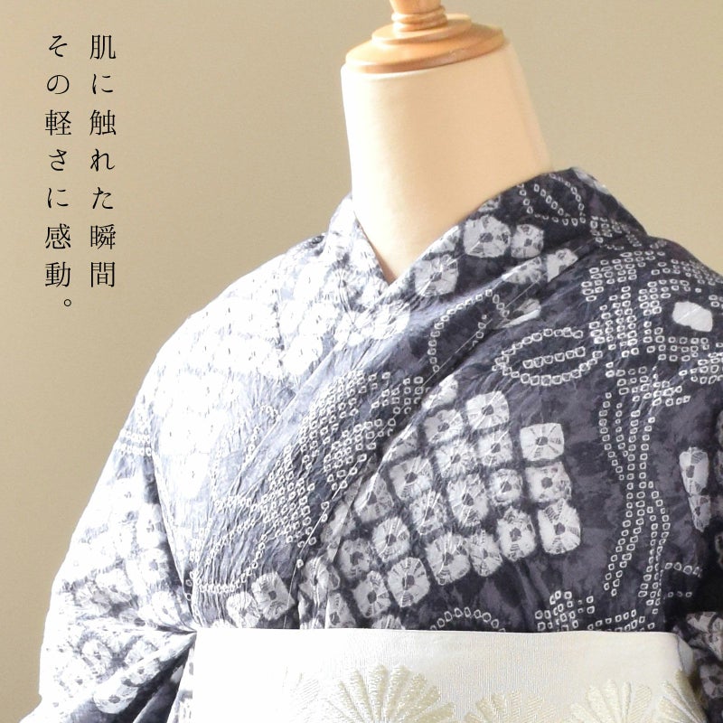 大人のお洒落な絞りの浴衣単品です。お仕立て上がりなので、すぐにご着用いただけます。絞りがやわらかで肌触りがよく、生地の凹凸があることで、肌にはり付きにくく、さわやかな着心地です。盆踊り、夏祭りにはもちろん、襦袢を合わせてちょっとしたお出かけにも、踊りなどのお稽古にもいいですね。