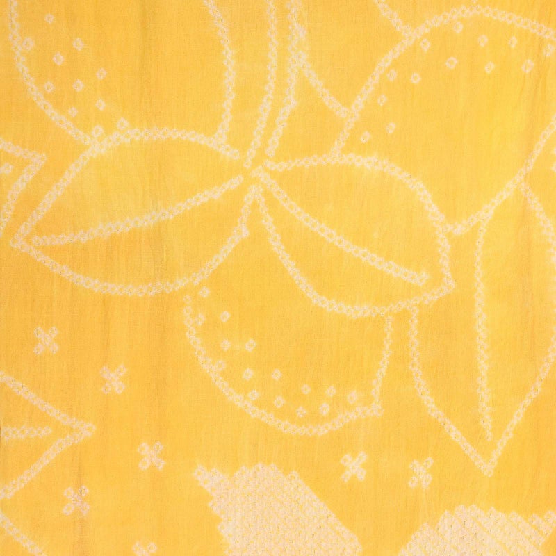 【色柄】軽い黄色の地に、白とごく淡い水色の細かな絞りを繋げて表現したレモンの実や葉。小さなドットの花。