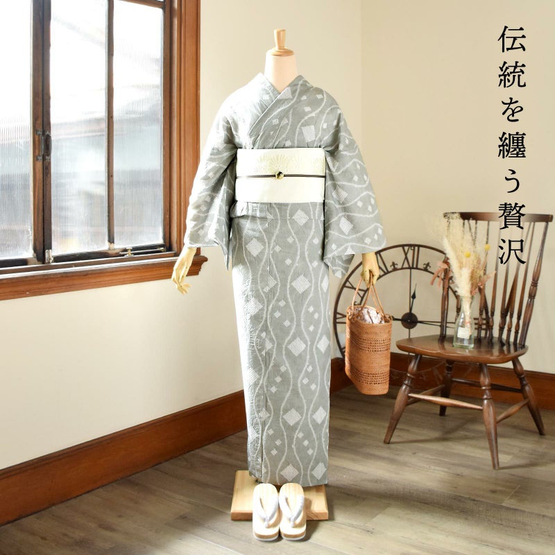【色柄】グレーの地に細かな白の絞りを繋げた立涌文様。大小の菱形。