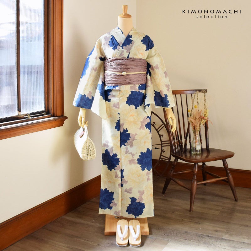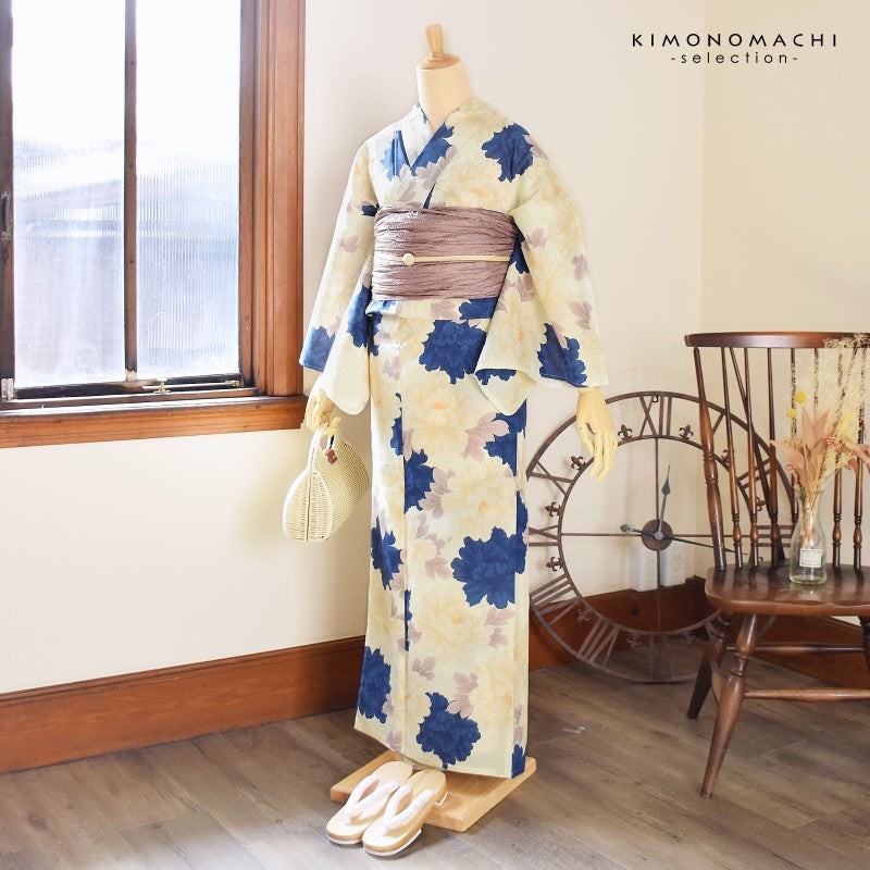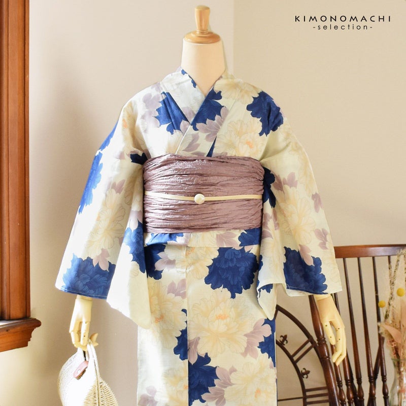 アイボリーの地に、淡いベージュのぼかしと紺青の牡丹の花。浅いオレンジの蕊。淡いパープルグレーの葉。洗練された落ち着きのある浴衣です。