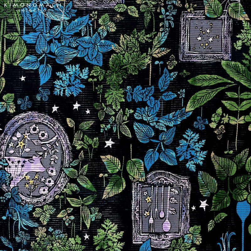 黒地にペンで描かれたかのような草花は、黄緑や鮮やかなターコイズブルーの配色。その合間に淡い藤紫色の額で飾られた牛やホタルブクロ、小鳥、スプーンなどの絵。