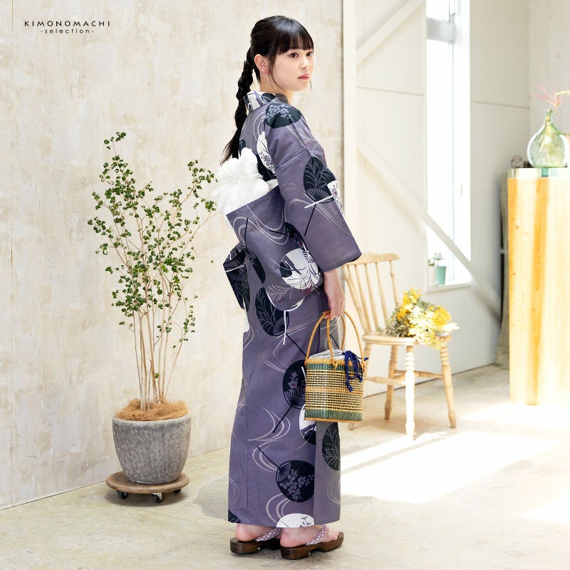 5. 浴衣 レディース 女性浴衣単品「グレー うちわ 3IS-2」綿浴衣 プレタ浴衣 お仕立て上がり浴衣 大人浴衣 Fサイズ 女性用 女性浴衣 ゆかた【メール便不可】
