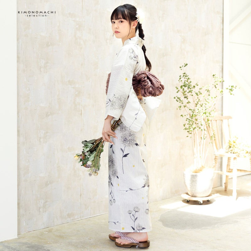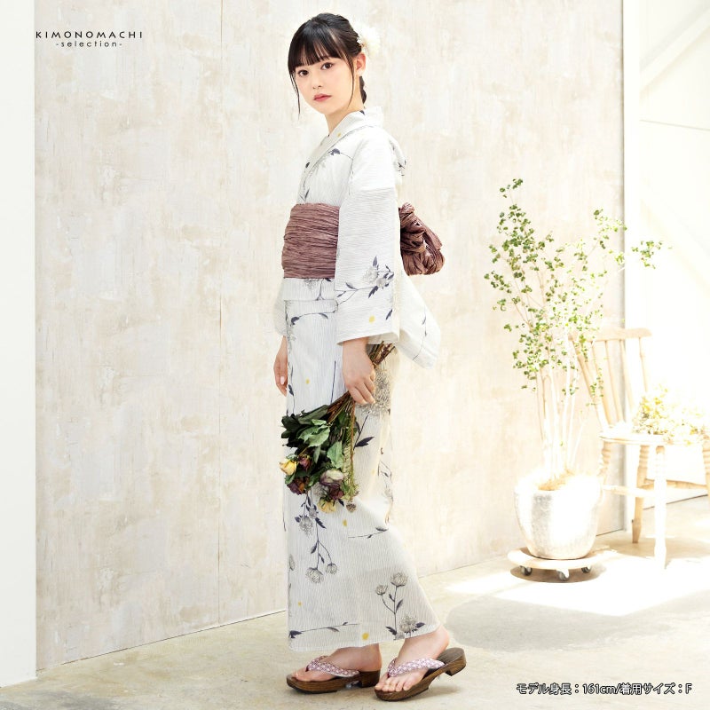 5. 浴衣 レディース 女性浴衣単品「白地 細縞に菊 3NT-2」綿浴衣 プレタ浴衣 お仕立て上がり浴衣 大人浴衣 Fサイズ 女性用 女性浴衣 ゆかた【メール便不可】