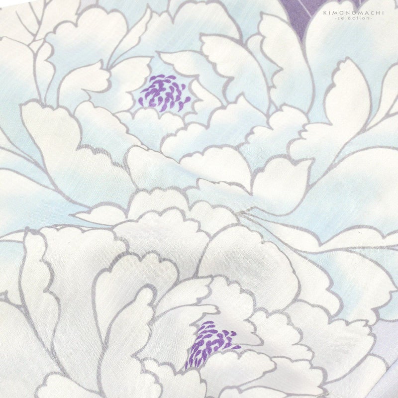 【色柄】ややグレイッシュな淡い青紫色の地に、大輪の牡丹の花模様。グレーの輪郭線に淡い水色や淡いグレーの花びら、藤色の葉、パープルの蕊。