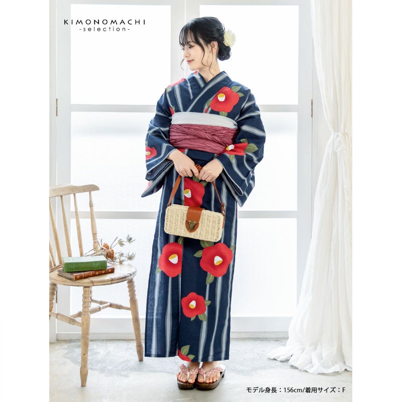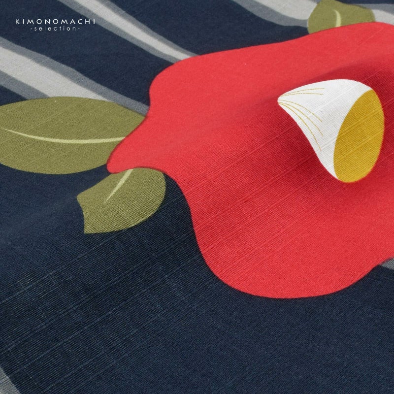 浴衣 レディース 女性浴衣単品 「紺地×赤 よろけ縞に椿」Fサイズ 綿浴衣