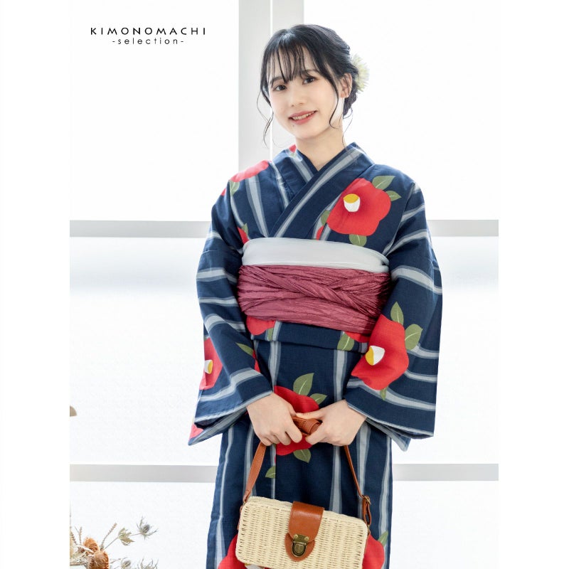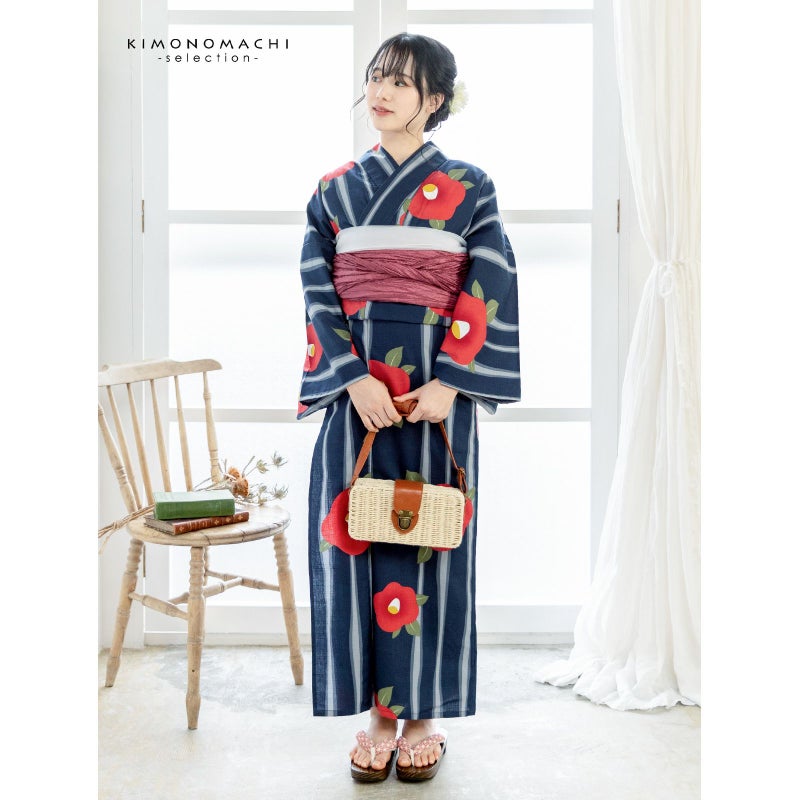浴衣 レディース 女性浴衣単品 「スイートリリー:紺地×赤 よろけ縞に椿」Fサイズ 綿浴衣 プレタ浴衣 お仕立て上がり浴衣 ブランド浴衣 大人浴衣 女性用 女性浴衣 ゆかた
