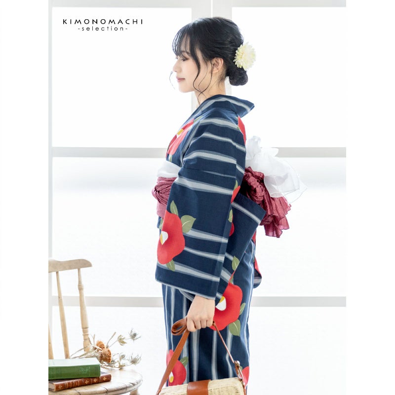 3. 浴衣 レディース 女性浴衣単品 「スイートリリー:紺地×赤 よろけ縞に椿」Fサイズ 綿浴衣 プレタ浴衣 お仕立て上がり浴衣 ブランド浴衣 大人浴衣 女性用 女性浴衣 ゆかた【メール便不可】