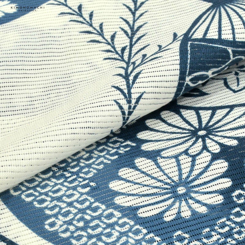 5. 浴衣 レディース 単品 お仕立て上がり浴衣 綿絽浴衣「うちわ 薄クリーム色地、さび紺」えんむすび Fサイズ シック 大人 モダン 粋 古典 ゆかた 女性 ブランド ブランド浴衣 花火大会 夏祭り 綿 絽 夏着物にも【メール便不可】