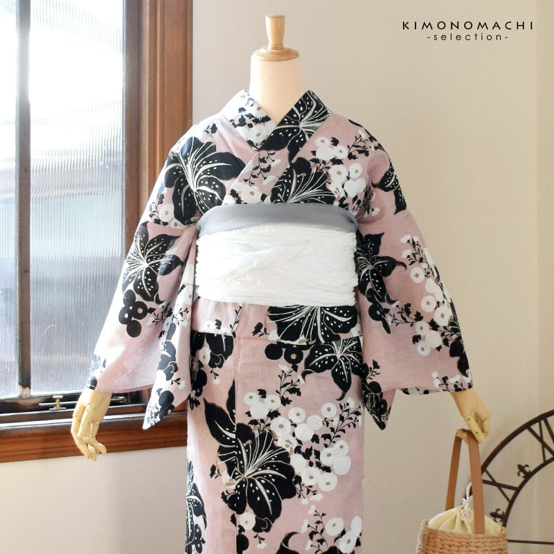 【色柄】織りで表現された乱調の縦縞の地。灰みのローズピンクの地、黒白で表現された小菊に黒い花びらの大きな百合。ポイントに白茶の線やドット。