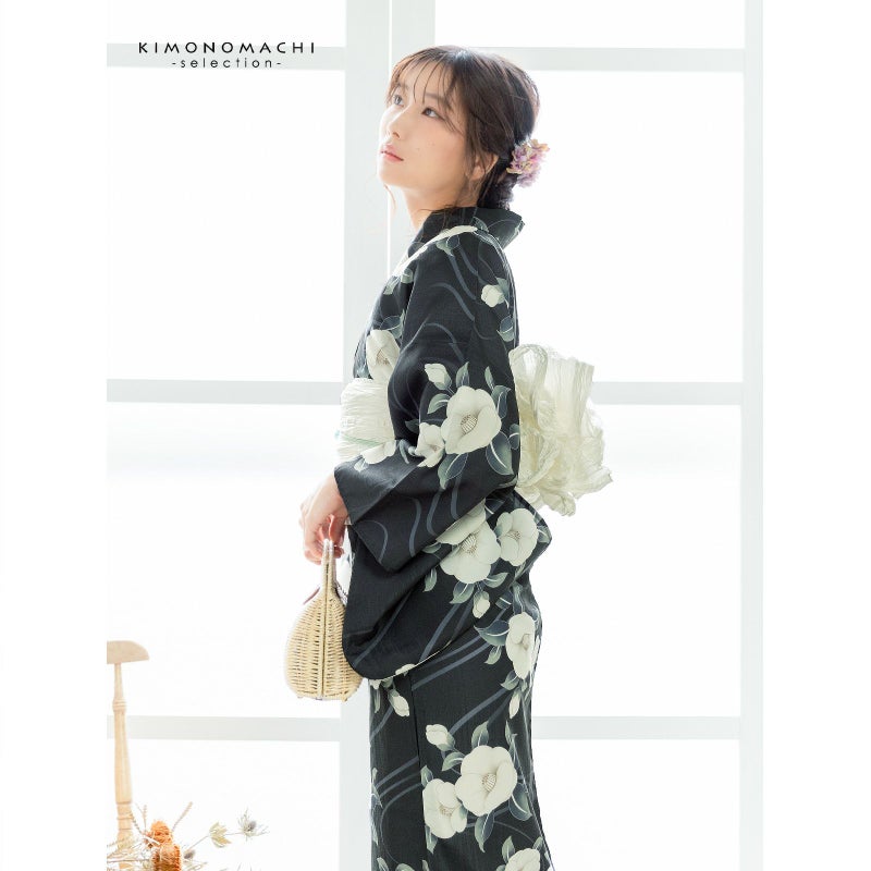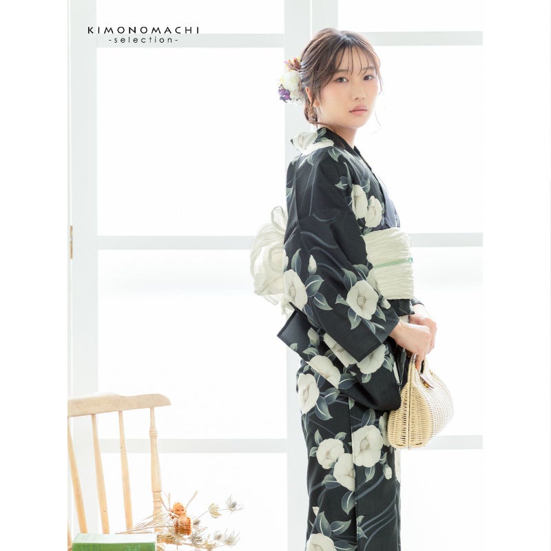 5. 浴衣 レディース 女性浴衣単品「椿 藍鉄色」ポリエステル浴衣 プレタ浴衣 お仕立て上がり浴衣 大人浴衣 Fサイズ 女性用 女性浴衣 ゆかた【メール便不可】
