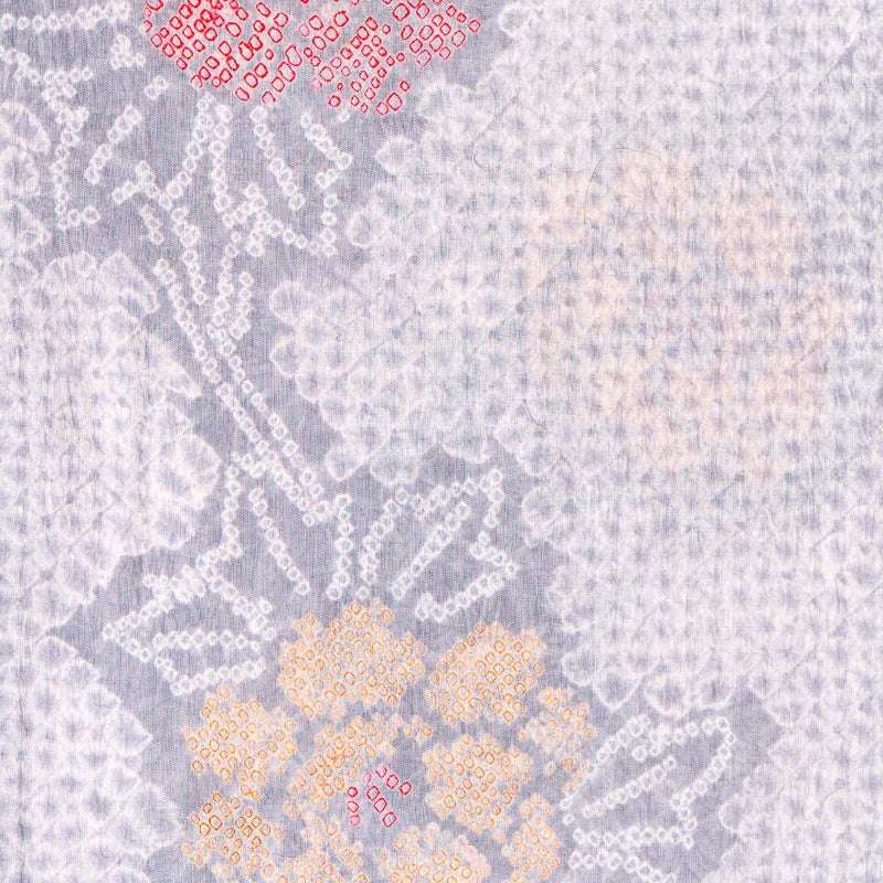 【色柄】淡いグレーにごく淡いピンクの三浦絞りを並べた地。細かな絞りを連ねて表現された牡丹の花、柔らかい紅赤や薄橙色の挿し色。