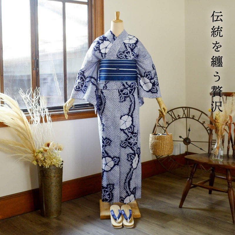 【色柄】濃紺に三浦絞りを並べた地。ひと目絞りを連ねて表現された蔓に、朝顔や白いお花が流れるように配置されています。