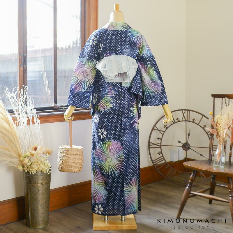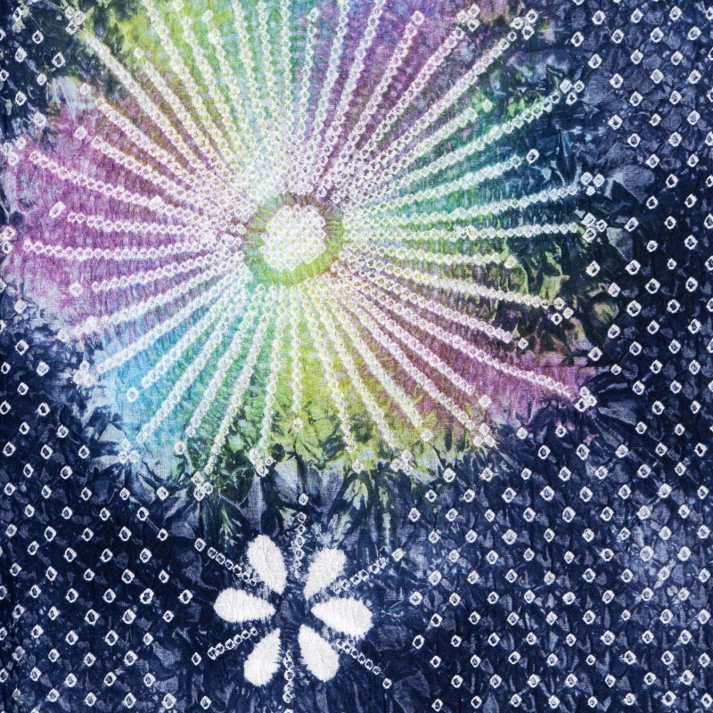 【色柄】濃淡のある紺藍に鹿の子を並べた地。細かな絞りを連ねて表現した花火の周りは紫、黄緑、水色などのグラデーション。白の絞りの小花。