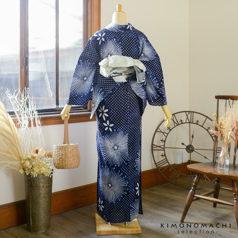 【色柄】濃紺に鹿の子を並べた地。細かな絞りを連ねて表現した花火に、白の絞りの小花。