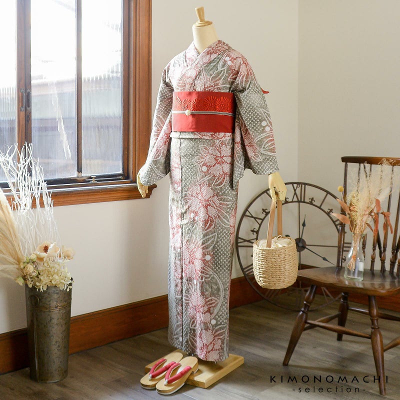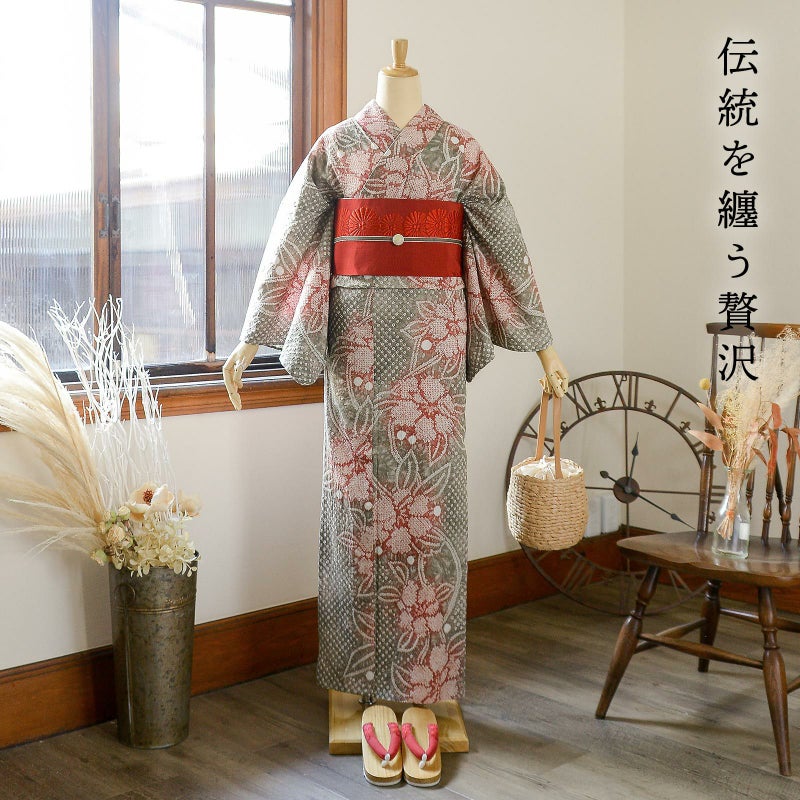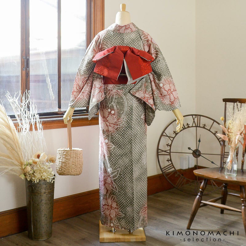 【色柄】濃淡のあるグレイッシュな抹茶色に鹿の子を並べた地。いろいろな絞りで表現された大きな花に蔓が流れるように配置されています。お花に鈍い赤の挿し色。