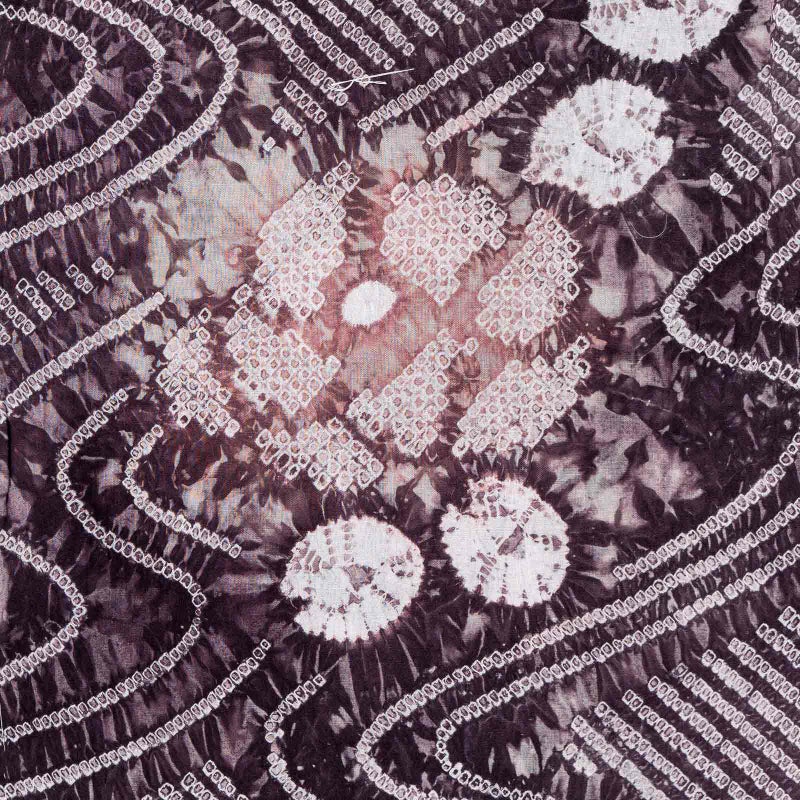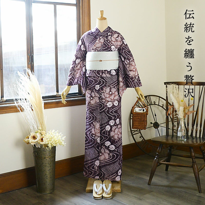 【色柄】グレイッシュな深紫色に鈍い赤紫色。細かな絞りを連ねて表現された流水にお花、絞りの水玉。