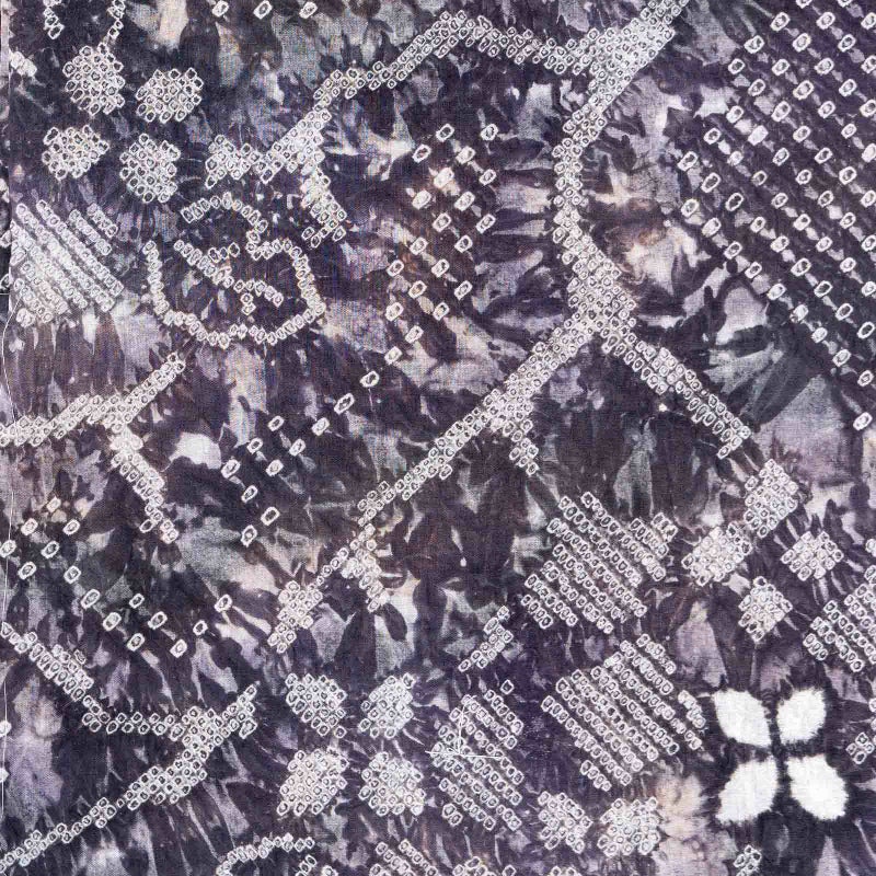 【色柄】濃淡のある灰みの紫や鳶色のぼかし。細かな絞りを連ねて表現された唐草にお花。