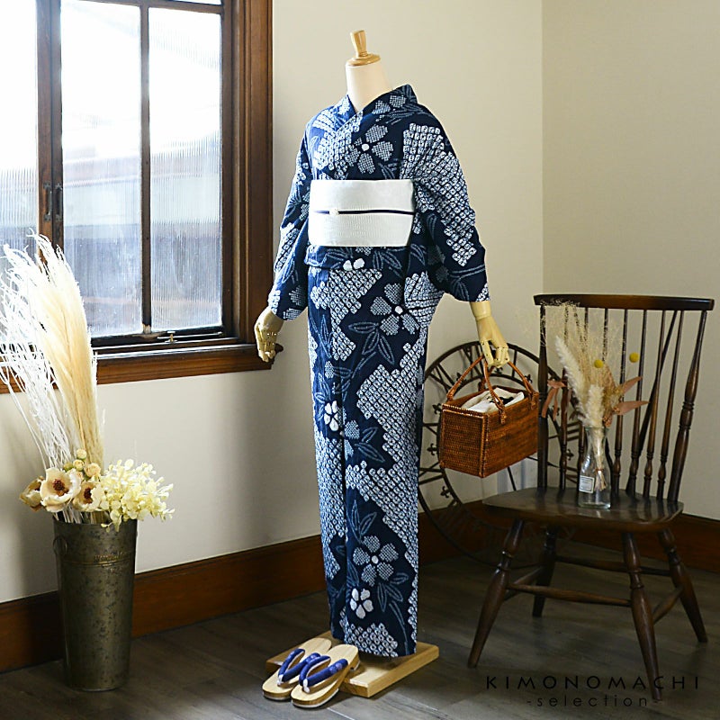 【色柄】濃紺に貝絞りを並べた地。細かな絞りを連ねて表現した五弁花に葉、茎が流れるように表現されています。