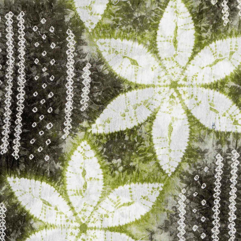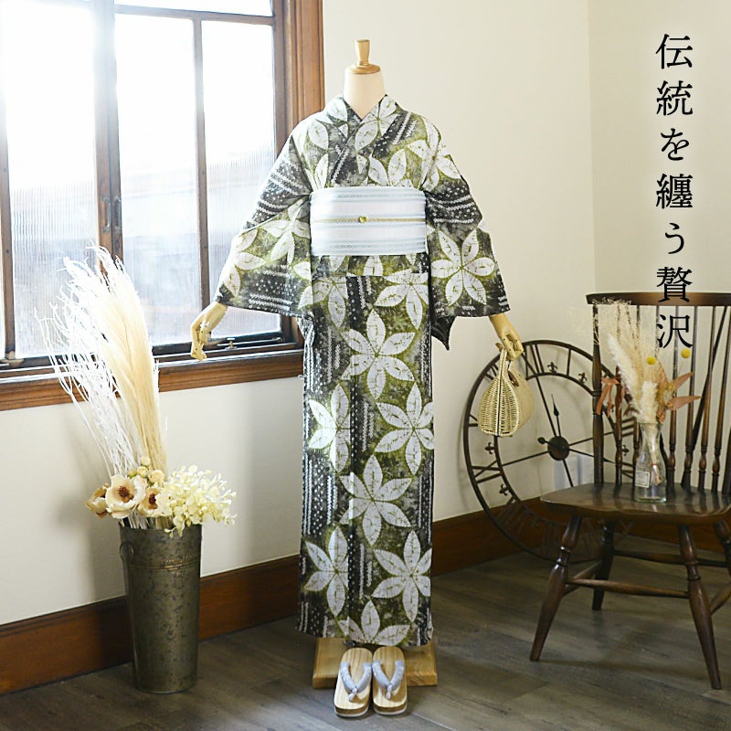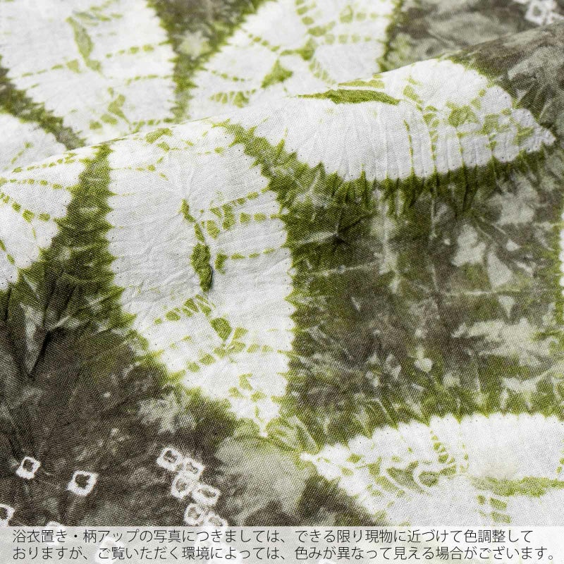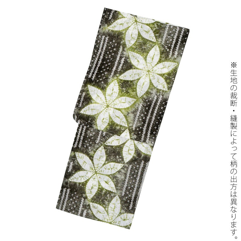 【色柄】墨色みの深緑にくすんだ黄緑。細かな絞りを連ねた直線に、大きな絞りの花びらの六弁花が流れるように配置されています。