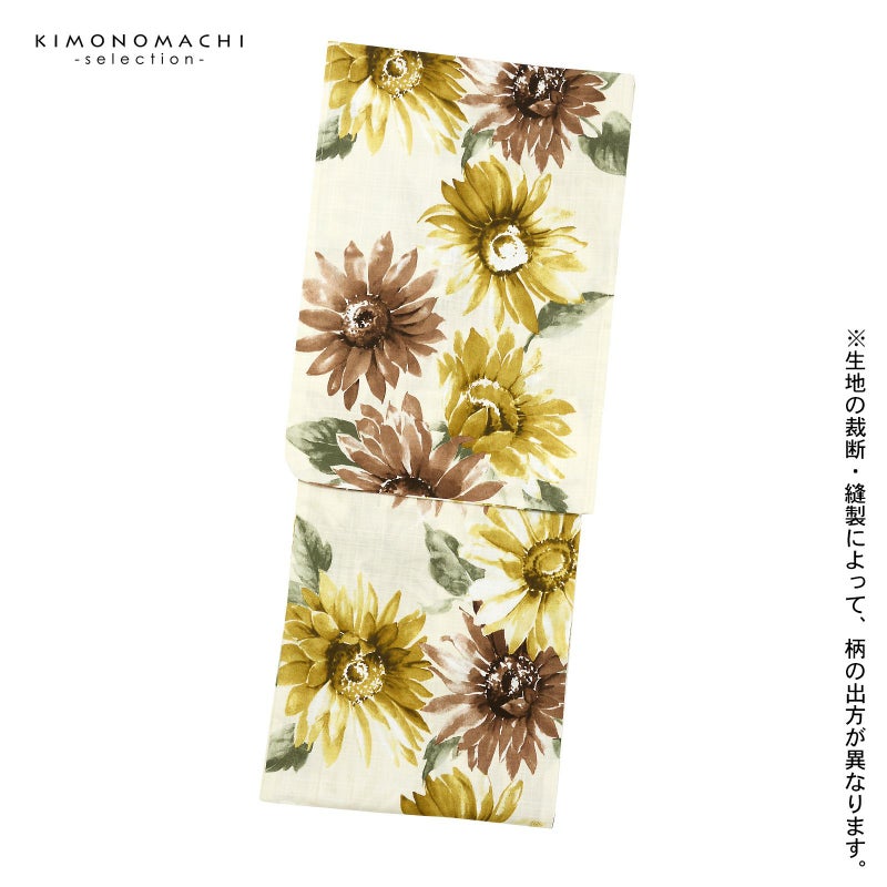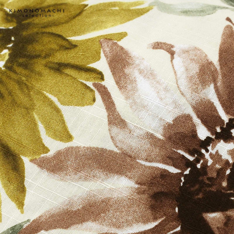 【色柄】アイボリーの地に水彩調の濃淡のあるヒマワリの花。白にオリーブ色、金茶や、ココアブラウン。