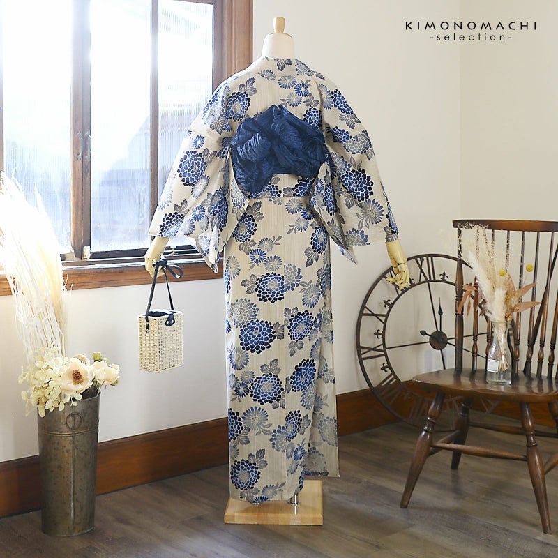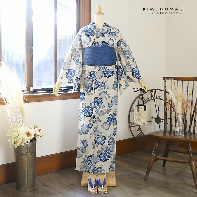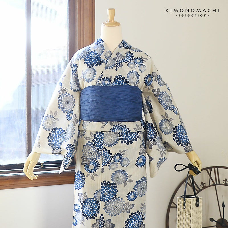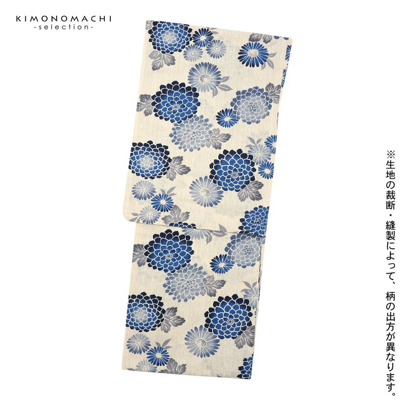 【色柄】白と生成り色が交じり合った生地。紺から青のぼかし風の八重菊にブルーグレーの菊の花々、グレーの葉。