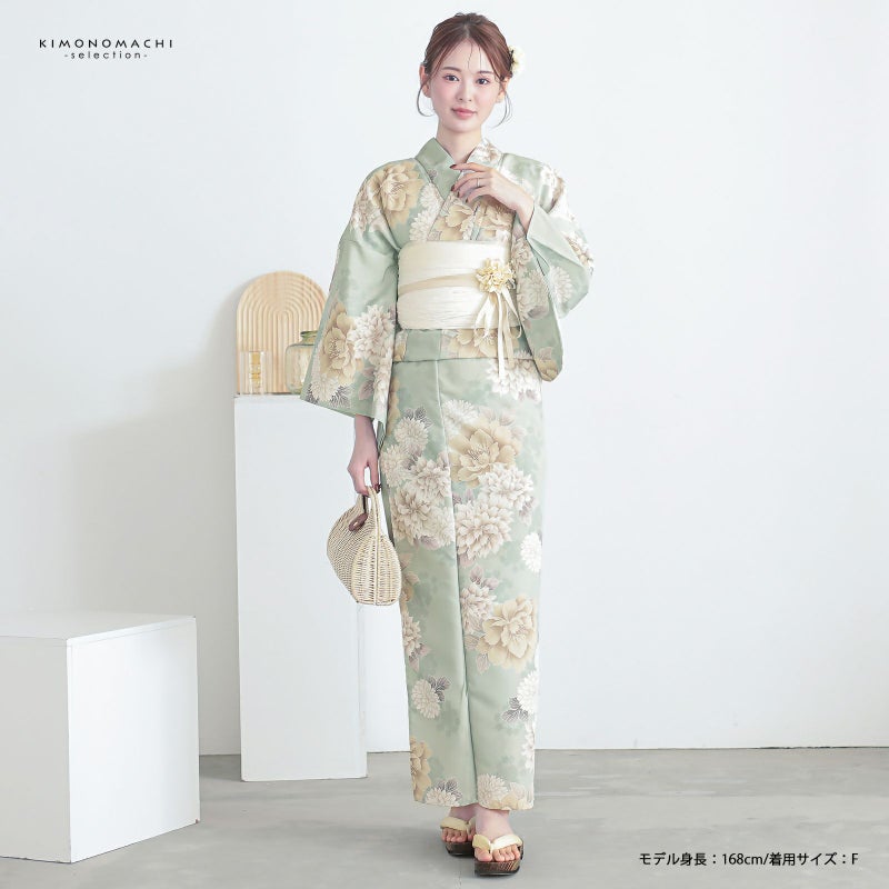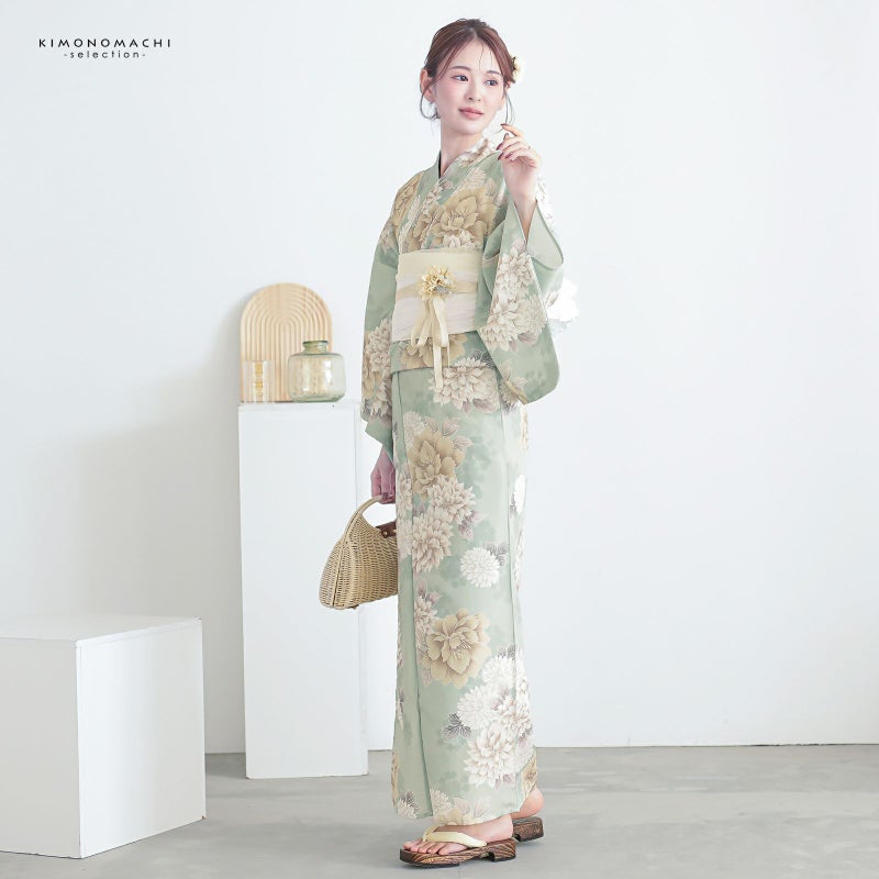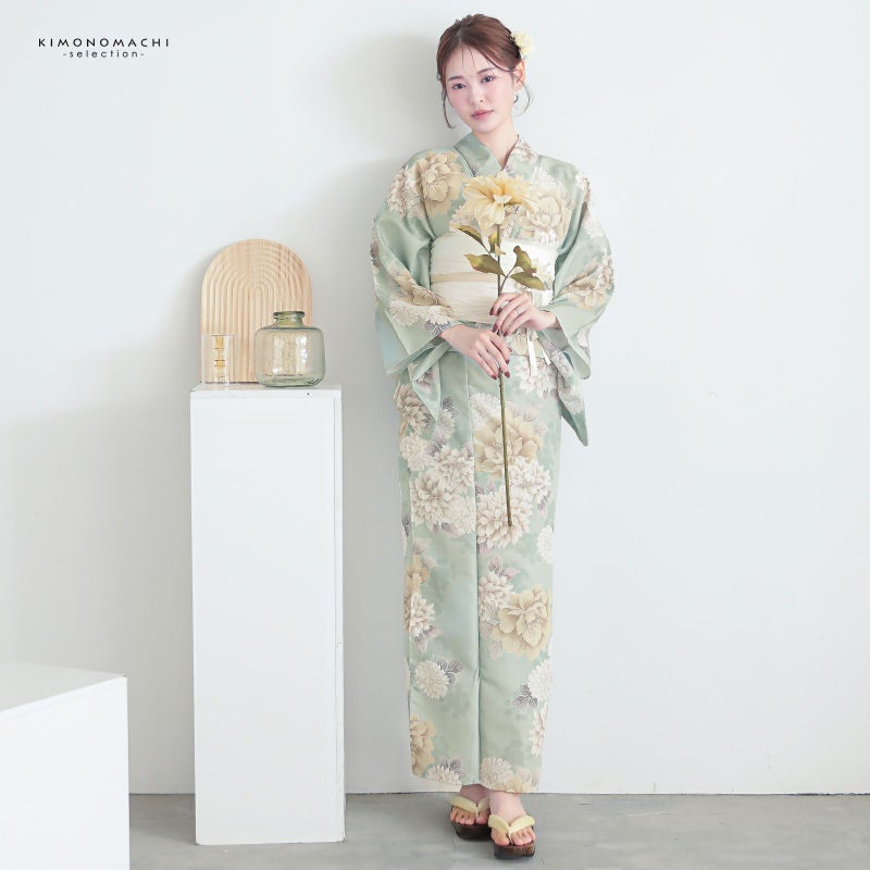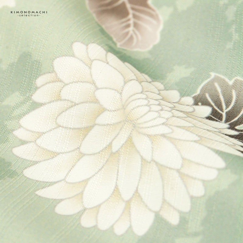 【色柄】グレイッシュな淡い黄緑色の地。アイボリーにベージュぼかし、くすんだ黄の菊や牡丹の花。グレージュの葉。灰緑色の小花のシルエット。