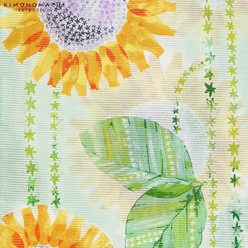 【色柄】淡いミントグリーンの地に縦向きに配置された黄緑、深緑の小さな星。明るい山吹色、橙色の花びらに中央は浅いパープルの大きな向日葵の花。淡い青緑に濃緑の葉の上にも小さな星が表現されています。
