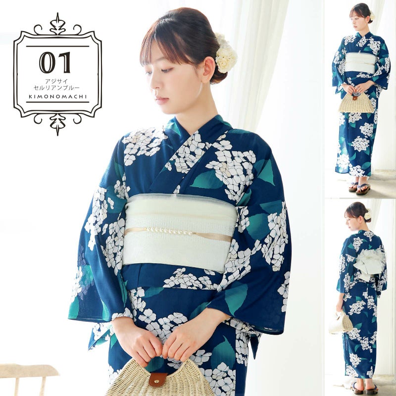 01.アジサイ セルリアンブルー:ややグレイッシュな深い青の地にオフホワイトと淡いベージュのアジサイの花、ターコイズに浅葱色のぼかしの葉。花びらの淡い青のぼかしに蕊の深い紺色がさわやかな印象を添えています。