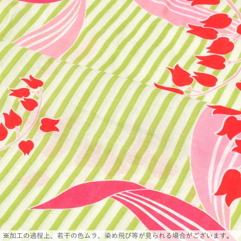 オフホワイトと明るい黄緑色のストライプの地に、抽象的なスズランの模様。ピンクや濃ピンクの葉、赤の花。