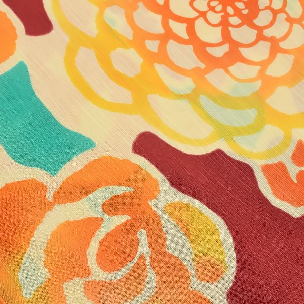 【カラー】薄黄色地に大きなゆらゆら縞、大きなお花模様。どこかレトロな色使いがポップでモダンな雰囲気。