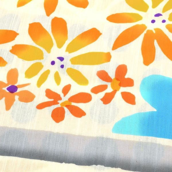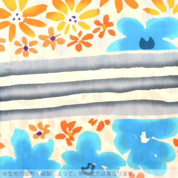 【カラー】淡い生成り地にお花、ボーダー、水玉の段模様。柔らかなタッチ、お花模様がポップで華やかな雰囲気。