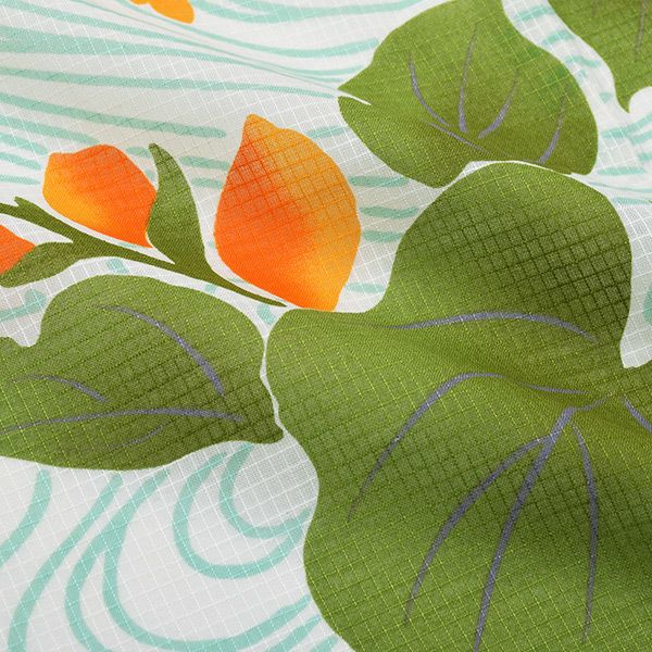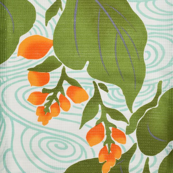 【カラー】わずかに生成りみを帯びた白色地に、ごく淡い青緑色の流水、くすんだ落ち着いた色合いの緑の葉、オレンジ色の花のつぼみ模様。