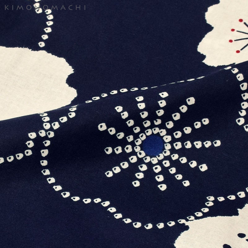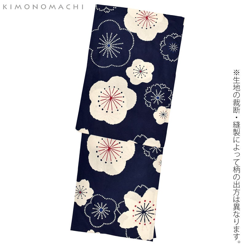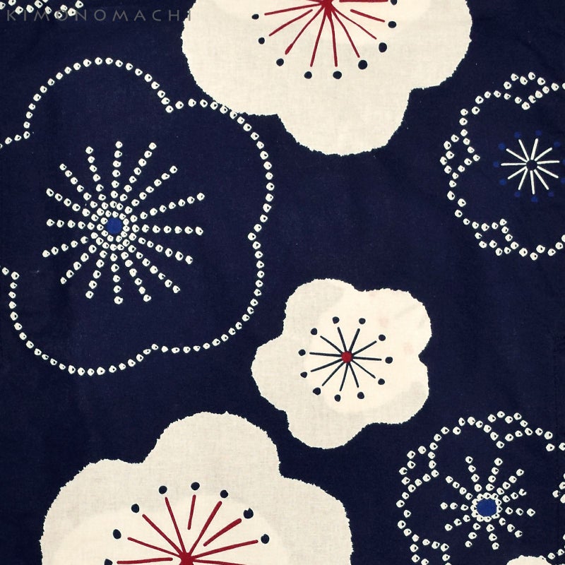 【色柄】深い紺色の地にごくごく淡い生成り色の梅と桜の花の浴衣です。花の蕊は深い赤や青。丸くやわらかい形の大小の花と、絞り風の鹿の子の線で表現した花々が、レトロな可愛さです。