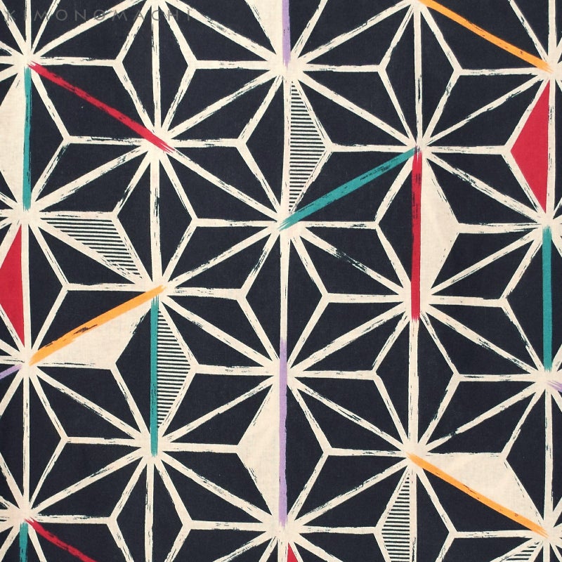 【色柄】黒地にごく淡い生成り色の麻の葉文様の浴衣です。赤や山吹色、藤色、ターコイズの線が彩りを添えます。