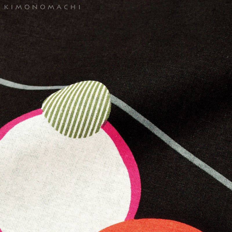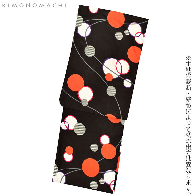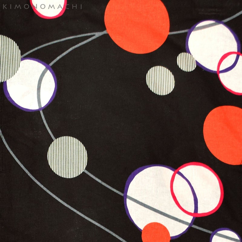 【色柄】ややくすんだ黒地に多彩な波のような曲線の浴衣です。紫やマゼンタの線で囲まれた水玉、オレンジ色、モスグリーンのストライプの水玉がグレーの曲線に遊ぶ楽しいデザイン。