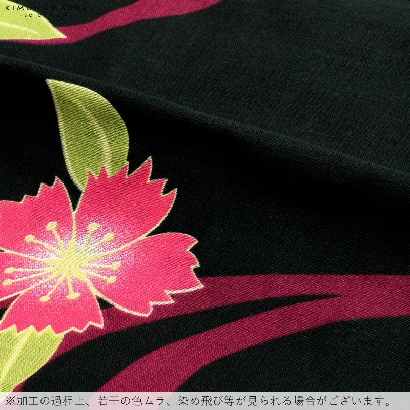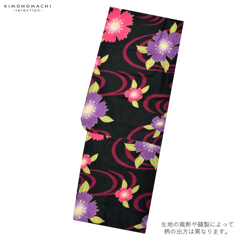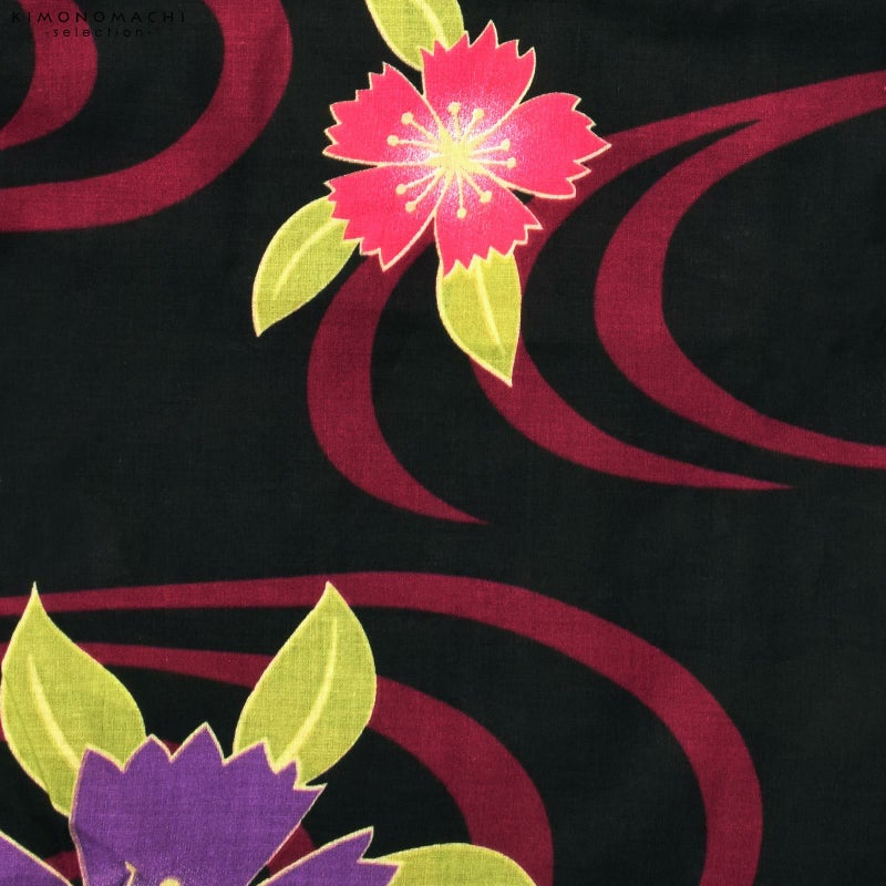 黒地に、深い赤紫色の流水模様、大小の撫子の花模様。淡い黄色に、落ち着いた紫色、濃ピンク色の花、黄緑色の葉。