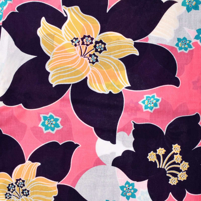 【カラー】明るいピンク色の地に白の花型のシルエット。紫紺と淡い黄色のカトレア風の花。ミントグリーンの星形の小花。