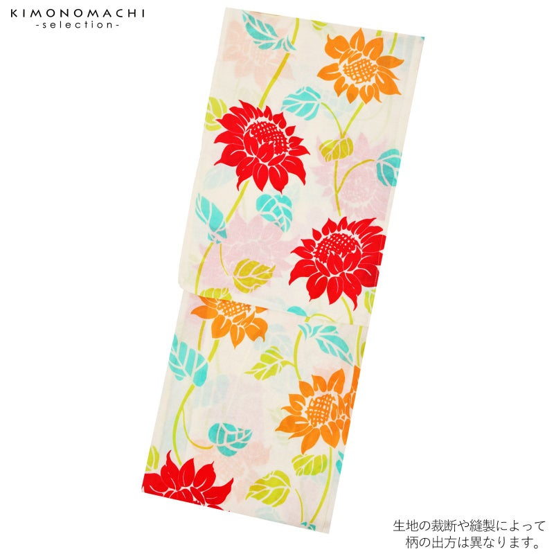 【カラー】淡いクリーム色の地に、明るい黄緑色の茎をのばしたヒマワリの柄。花は赤や淡いオレンジ色。ミントグリーンの葉。