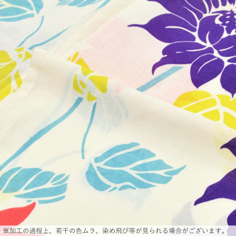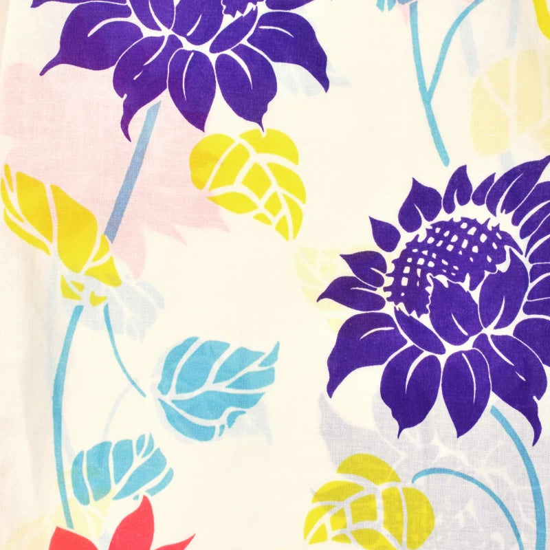 【カラー】淡いクリーム色の地に、ターコイズ色の茎をのばしたヒマワリの柄。花は浅い赤や深い青紫色。明るいイエローの葉。