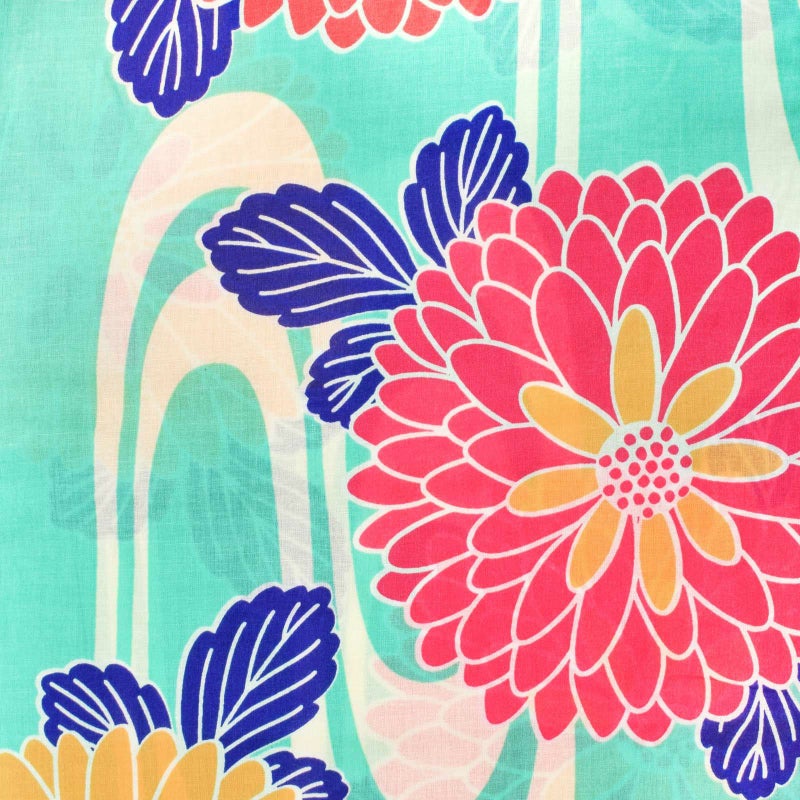 【カラー】明るいミントグリーンの地に、縦に流れるオフホワイトの流水模様。濃いピンクやオレンジ色のジニア(百日草)の花。深い青の葉。